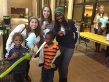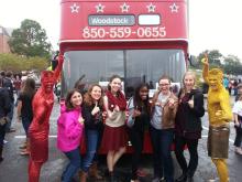 • group of people standing in front of a fire truck posing with the garnet and gold guys